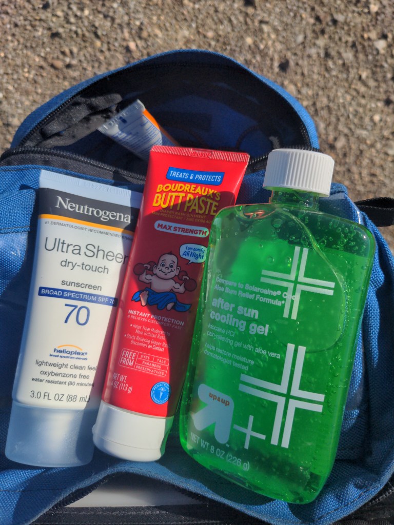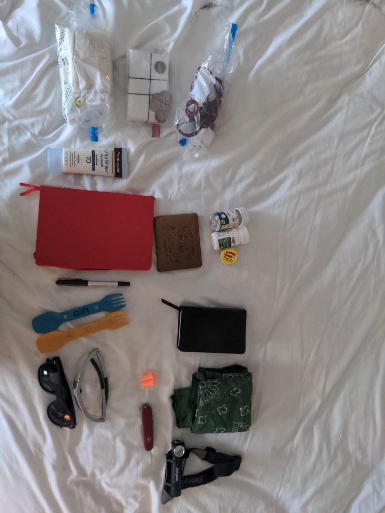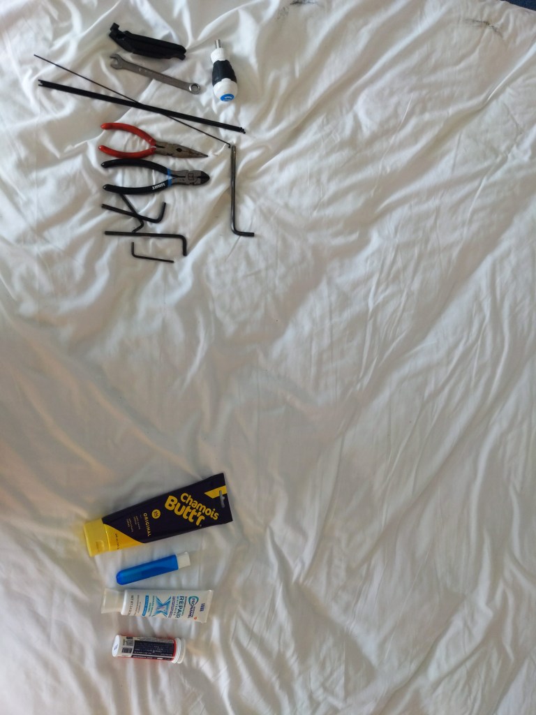 Handlebar bag: Top to bottom. Bag with folded TP that I refill when needed and wet wipes and hand sanitizer. Index cards and quarters. Bag with phone and tailight charger. Sunscreen, journal, wallet, asprin, ibuprofen, chaptick, pen, spoons, bible, glasses, earplugs, knife, bandana, and flashlight.