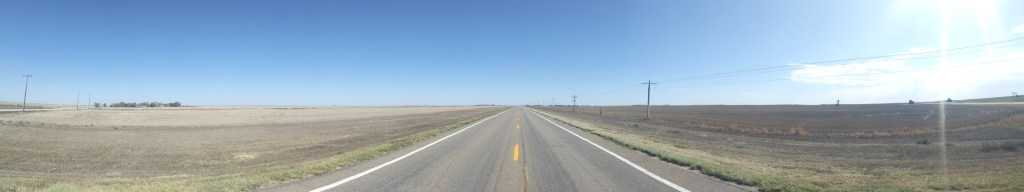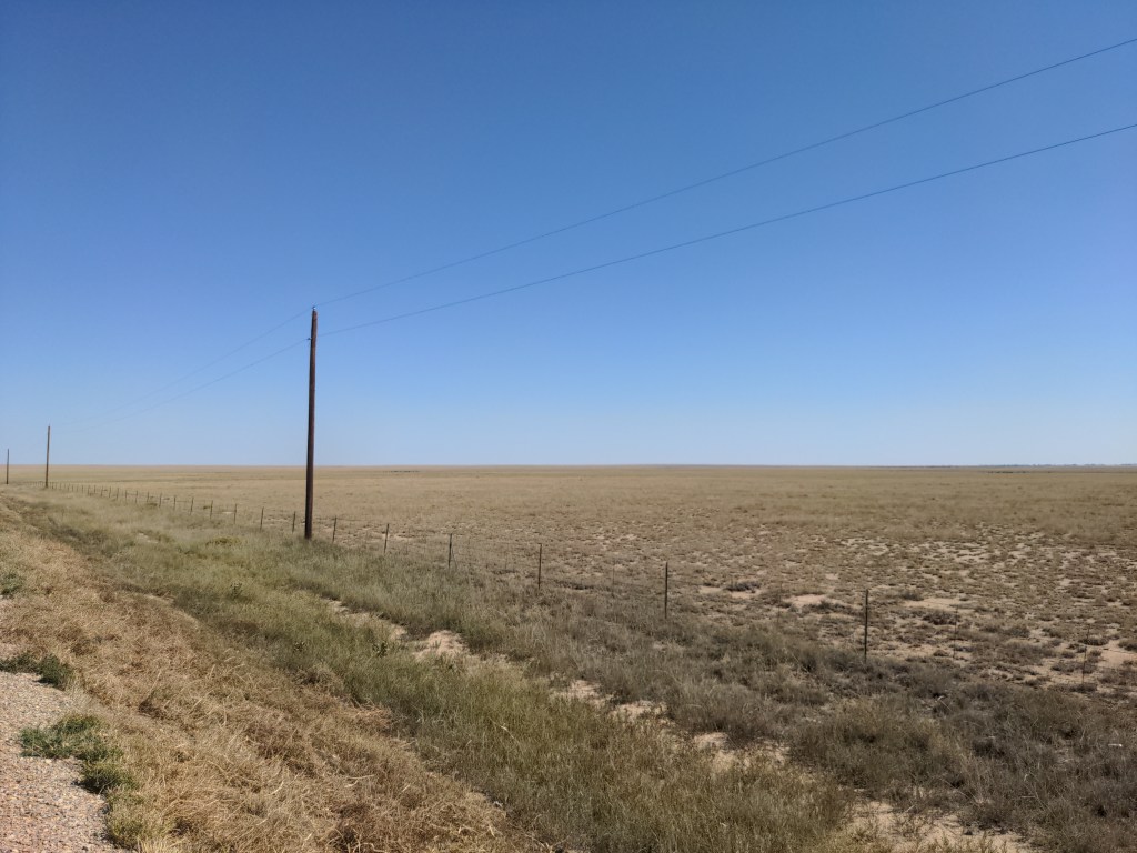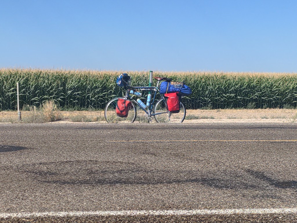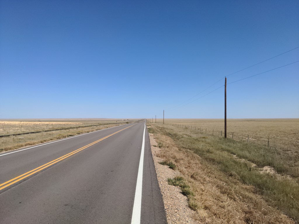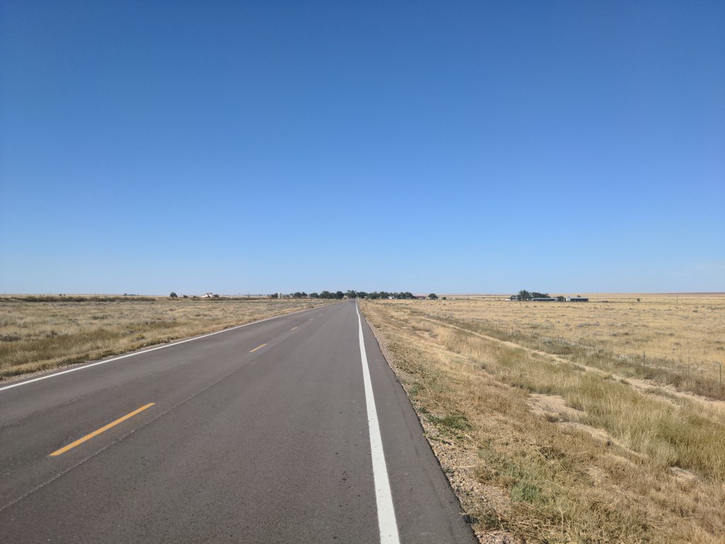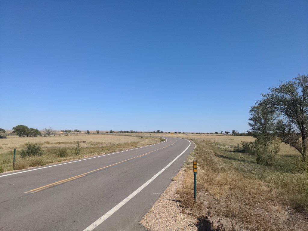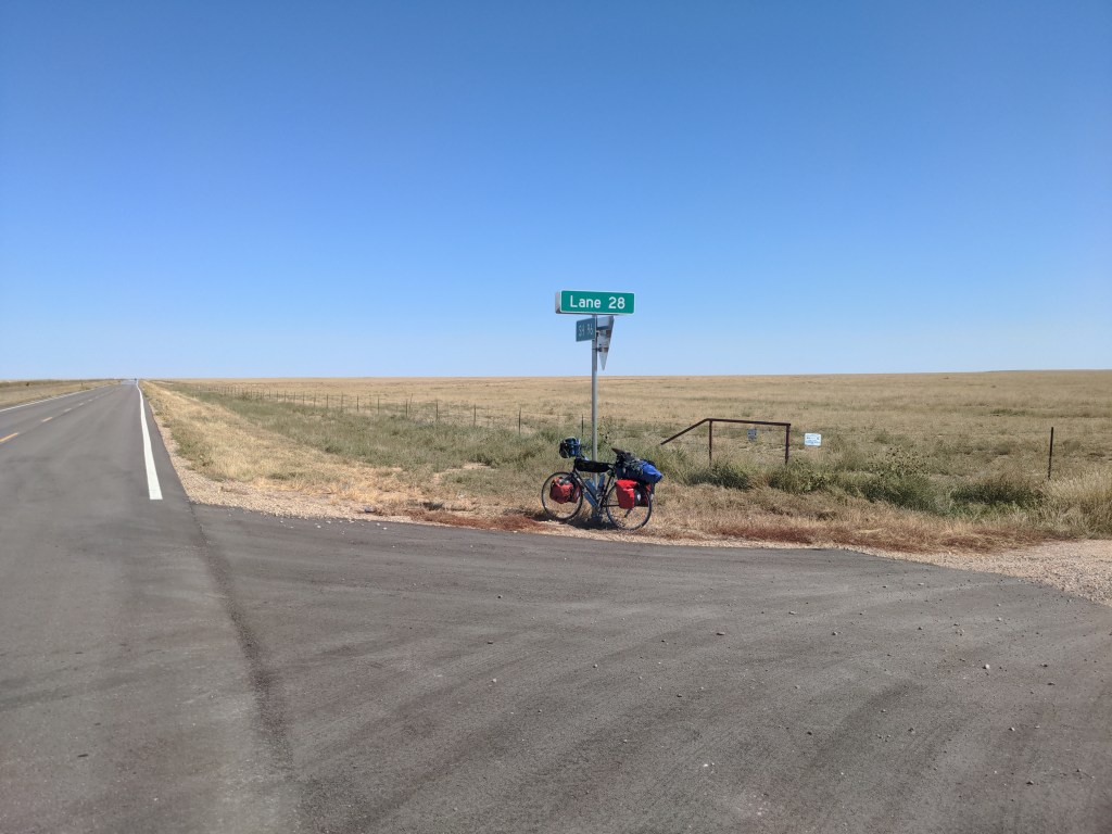 On Monday I was still in Colorado. I rode through the plains to the Sheridan Lake Bible church, where I met Irwin from Switzerland, and we drank milk and compared notes and maps. I cooked dinner, and he cooked breakfast. It was nice to chat and see yet another amazing European bike. The scenery was the same as all of eastern Colorado; empty grassland.