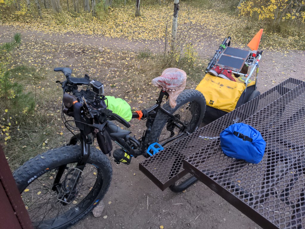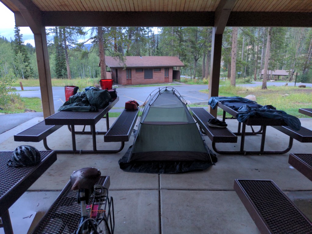 Wednesday was a short ride, and I got a bed at a hostel to stay out of the worst of the rain. I’m sure it could be ridden through, but I am not experienced at riding over 10,000 feet in a thunderstorm. 7,000 feet in a thunderstorm was bad enough for me. Met up with a British long distance hiker doing the same as me, and we talked most of the day. The windows shook with thunder all night, so I wa shappy to be inside.
