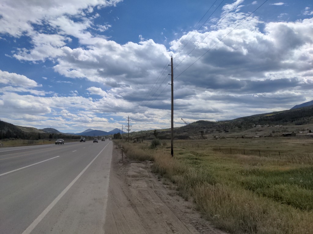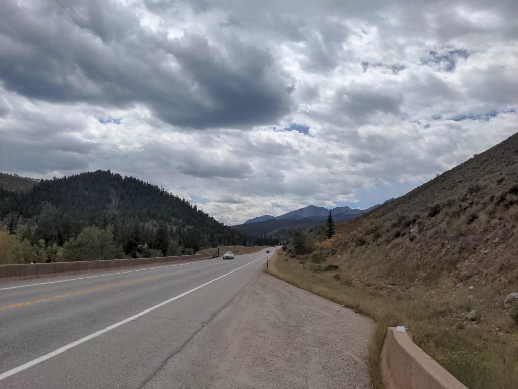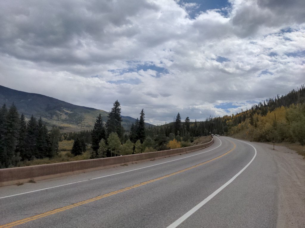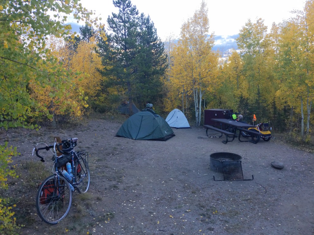 Tuesday I left Kremmling, and was officially back on the TransAm route, after about 1000 miles off of it. I put on my rain gear, since rain was predicted most of the week. Again, just lots of climbing. Passed a nice lake though. I camped by another lake near Silverthorne, with one old friend and one new friend. We stayed up and shared bike stories, and worryingly checked the weather. It didn’t rain that night, though.