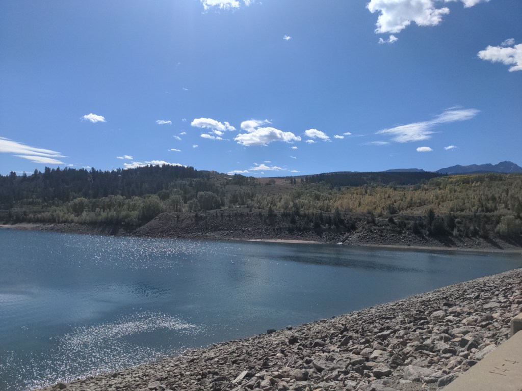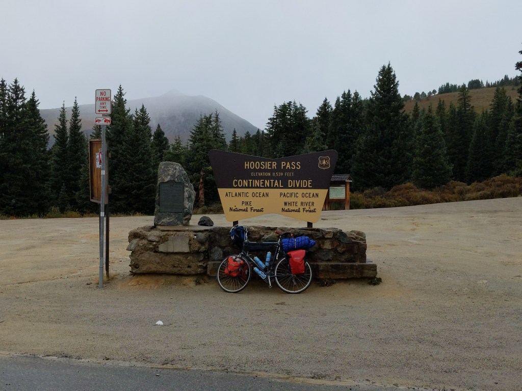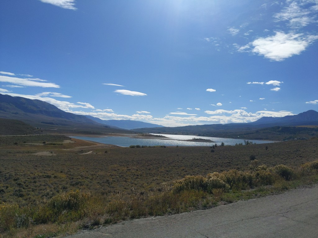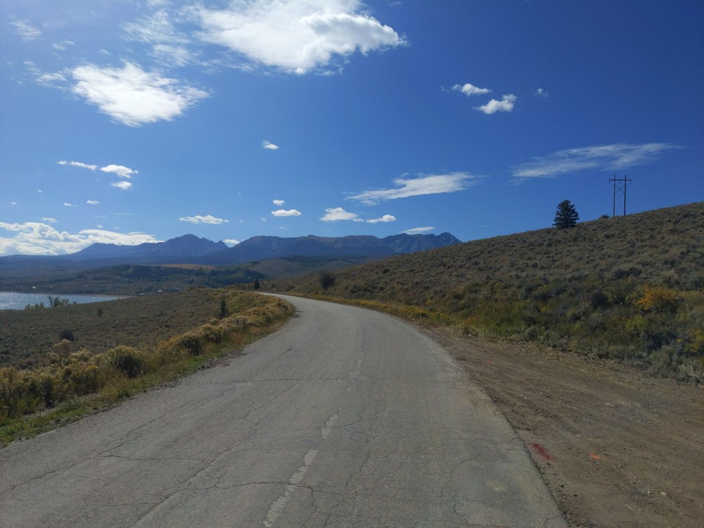 Tuesday I left Kremmling, and was officially back on the TransAm route, after about 1000 miles off of it. I put on my rain gear, since rain was predicted most of the week. Again, just lots of climbing. Passed a nice lake though. I camped by another lake near Silverthorne, with one old friend and one new friend. We stayed up and shared bike stories, and worryingly checked the weather. It didn’t rain that night, though.