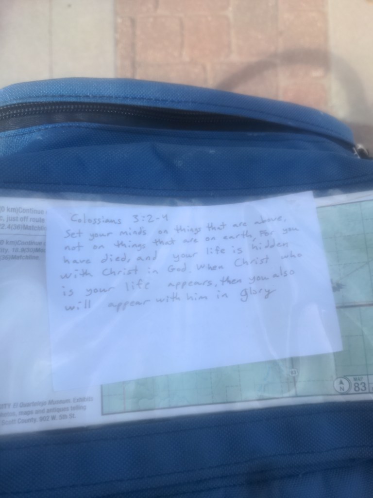 Well my phone crashed uploading pictures, and I just lost 2 hours of great writing. I met some really colorful characters last week and wrote an amazing contrast and talked about storing your treasures in heaven. It was great. But now I’m getting ready for bed, so I will have to finish talking about my ride another time. I’m pretty bummed because I think it was a great write up. So you’ll just have to read about it later. I’m sorry this is both late and incomplete.