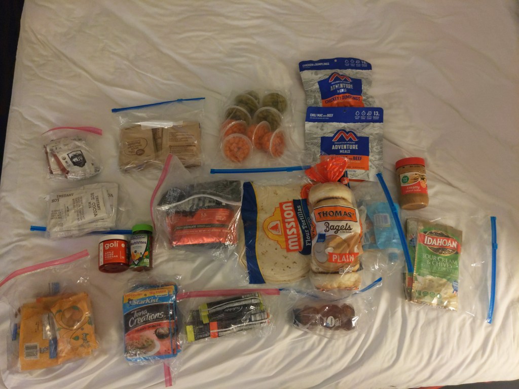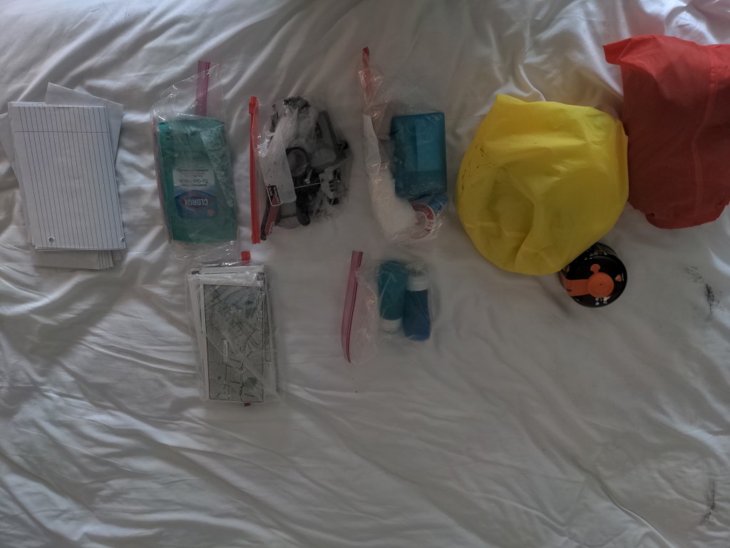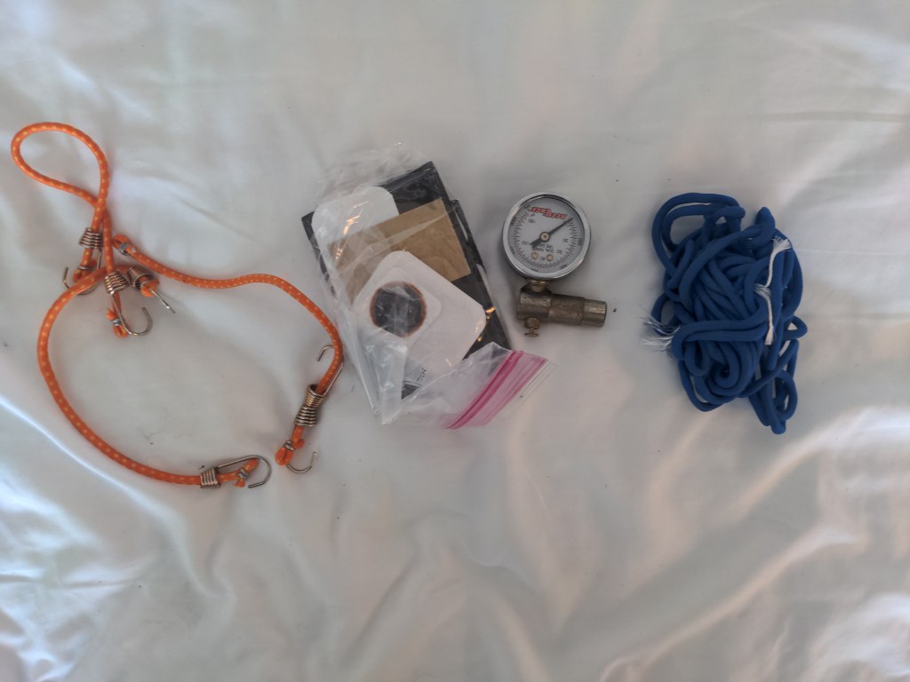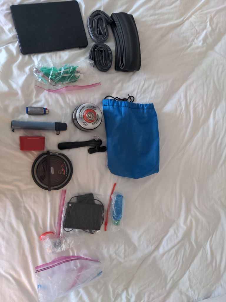 Front left, top to bottom: Tablet (way too big), extra tubes and a tire, toiletries. The blue bag is my kitchen bag, which holds a lighter with my duct tape, lifestraw, stove in red box, gas can, can opener, collapsable pot with lid and two mugs. Below that is my electronics bag, which holds some cables, a keyboard, and a battery pack. To the right is soapy water to find punctures. There is also water treatment tablets below, and a ziploc bag with extra bags. Keeping everything in smaller bags helps a lot.