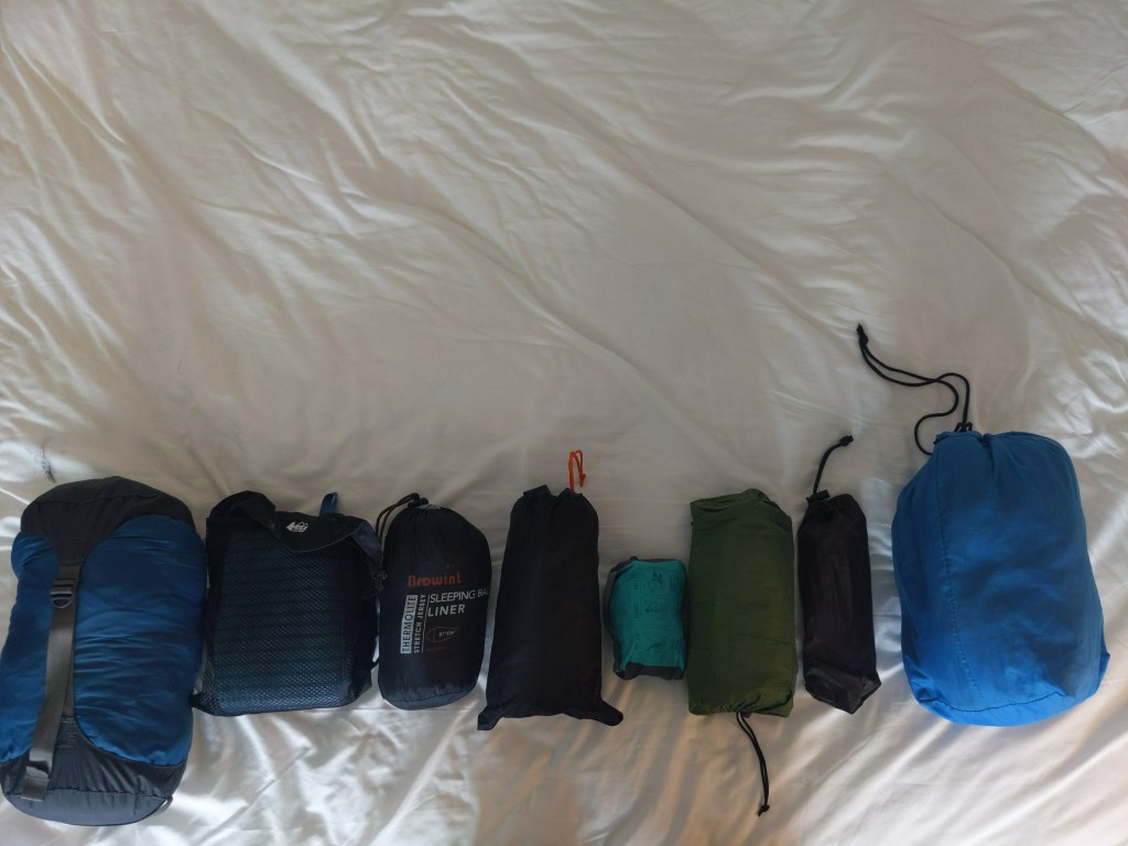 Rear right: From left to right. Compression sack with extra clothes, towel, sleeping bag liner, tent footprint, pillow, sleeping pad, tent stakes, and jacket in the blue bag.