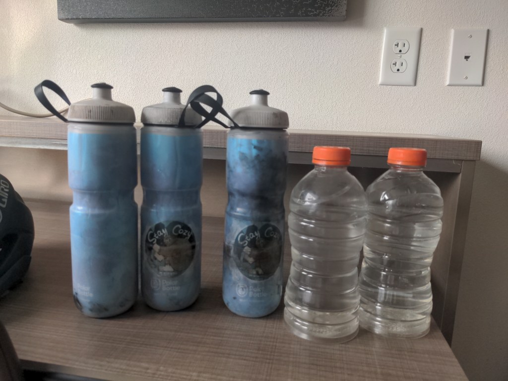 The heroes of the trip. The two bottles with bigfoot stickers go up top. The two old gatorade bottles strap to my front panniers. I bring out the 2 liter bladder if I’m going to be two days between guaranteed water.