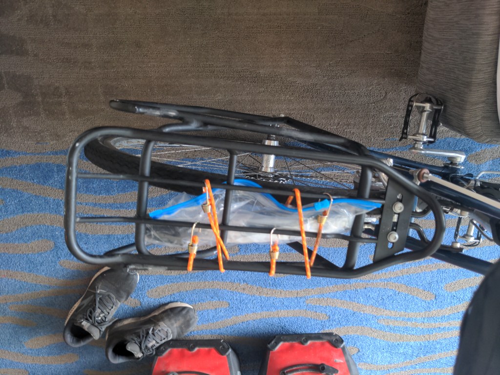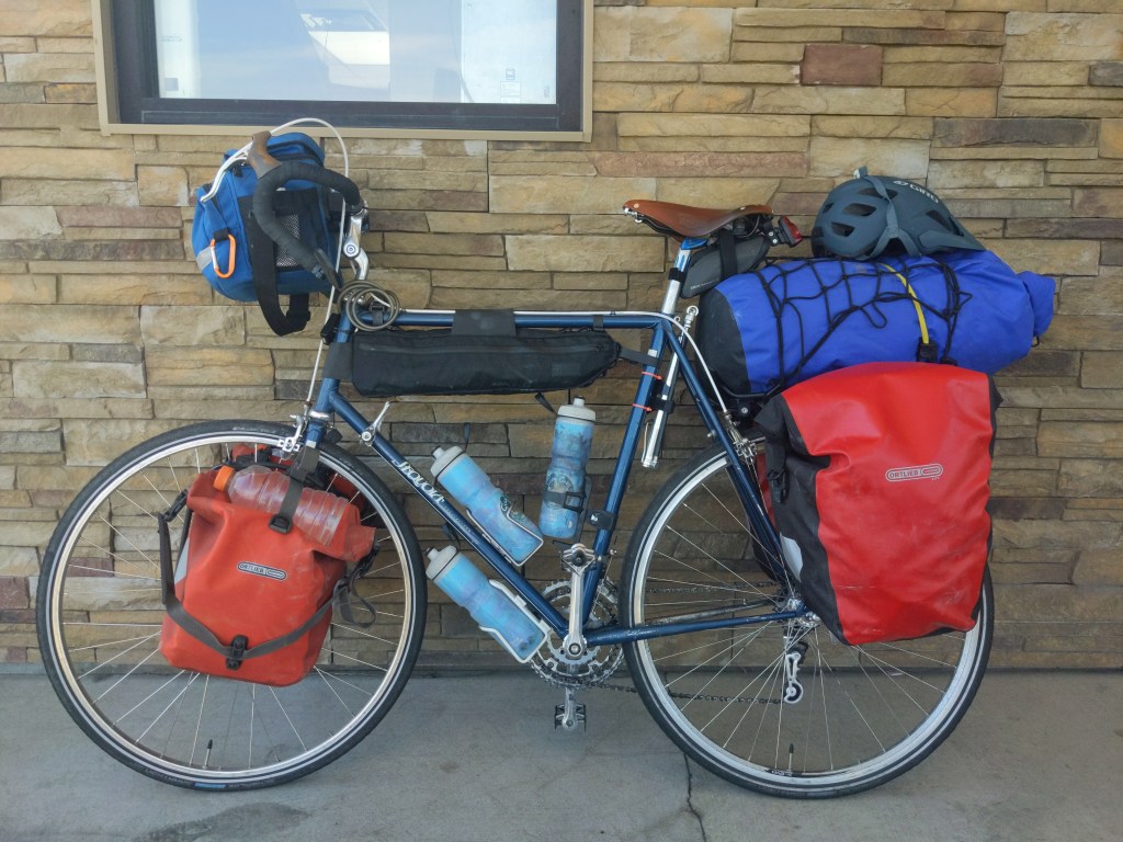 I’ve got 4 panniers. 2 front, and 2 rear. A handlebar bag, black frame bag in the middle, seat bag under the seat, and my big blue bag. The big blue bag holds my tent and sleeping bag. My pump is mounted below the seat, and my lock is wrapped up by the handlebars. The motorcycle net on the blue bag is great, because I can stuff things in it. If I start the day with a jacket, I stuff it there as it warms up. Trash, extra water, anything fits easily.