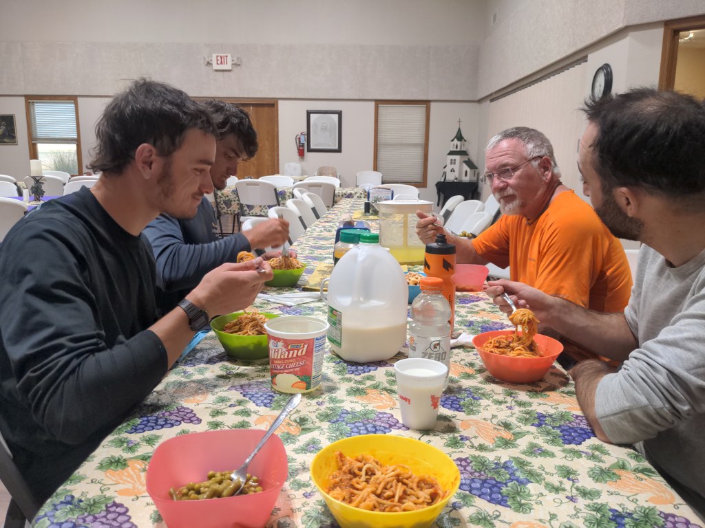 Wednesday was the first day in Kansas without a headwind, and the scenery finally started to change from flat and straight to a few little hills and sometimes trees. That night we caught up with Matt, and we all stayed in a Lutheran church outside of Walnut, Kansas. They had a Wednesday night service, and it was great to attend and meet the congregation.