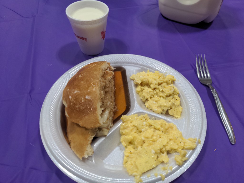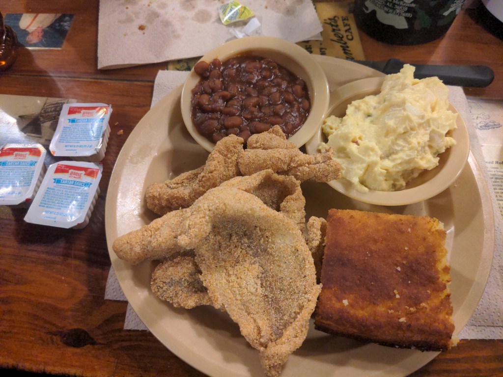 Friday was the start of the Ozarks. Not mountains for someone used to the Sierras, but it’s a constant up and down road. We were close to Springfield, and needed to start thinking about an airport for my ex-coworker to fly out of, so we turned south. Stayed with a nice couple and took Saturday as a rest day. Went to a big sporting goods store, and visited a restaraunt where the waiters throw you the rolls across the room. Quite a silly experience.